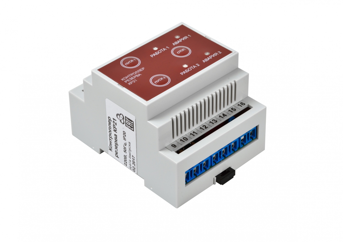 - Микропроцессорный контроллер резерва КР21 управляет работой основного и резервного двигателя вентилятора или насоса, обеспечивая непрерывность работы системы.